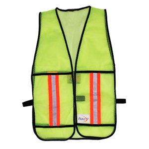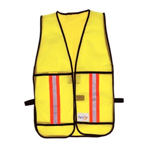 Fabricado en malla de poliéster fluorescente con elásticos laterales, cierre de velcro al frente, biés de cinta de polipropileno de 1” (2.5 cm) para mayor resistencia y dos reflejantes verticales, unitalla.