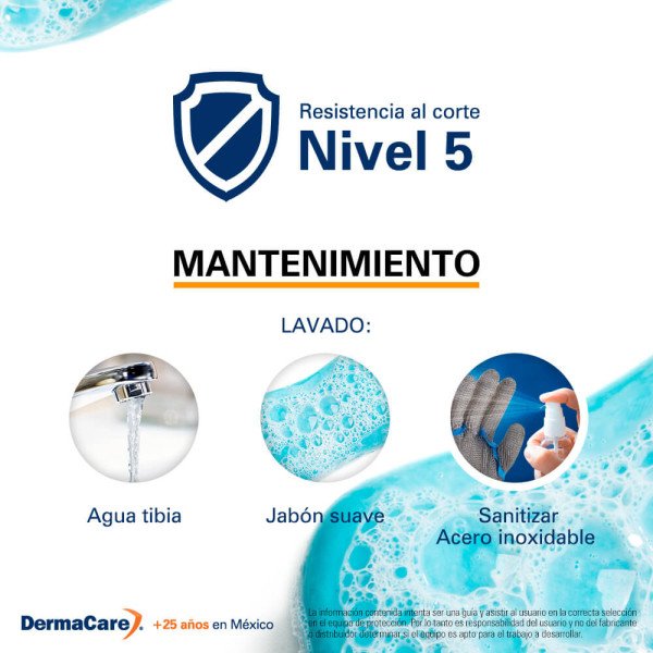 «Fabricado con los más altos estándares de calidad, protección anticorte tales con cuchillos y sierras eléctricas, así como cuchillos manuales. Ideal para uso en carnicerías, manejo de cuero o industrias papeleras. Fácil de quitar en caso de emergencia. Aceptado por la FDA para la manipulación de alimentos.»